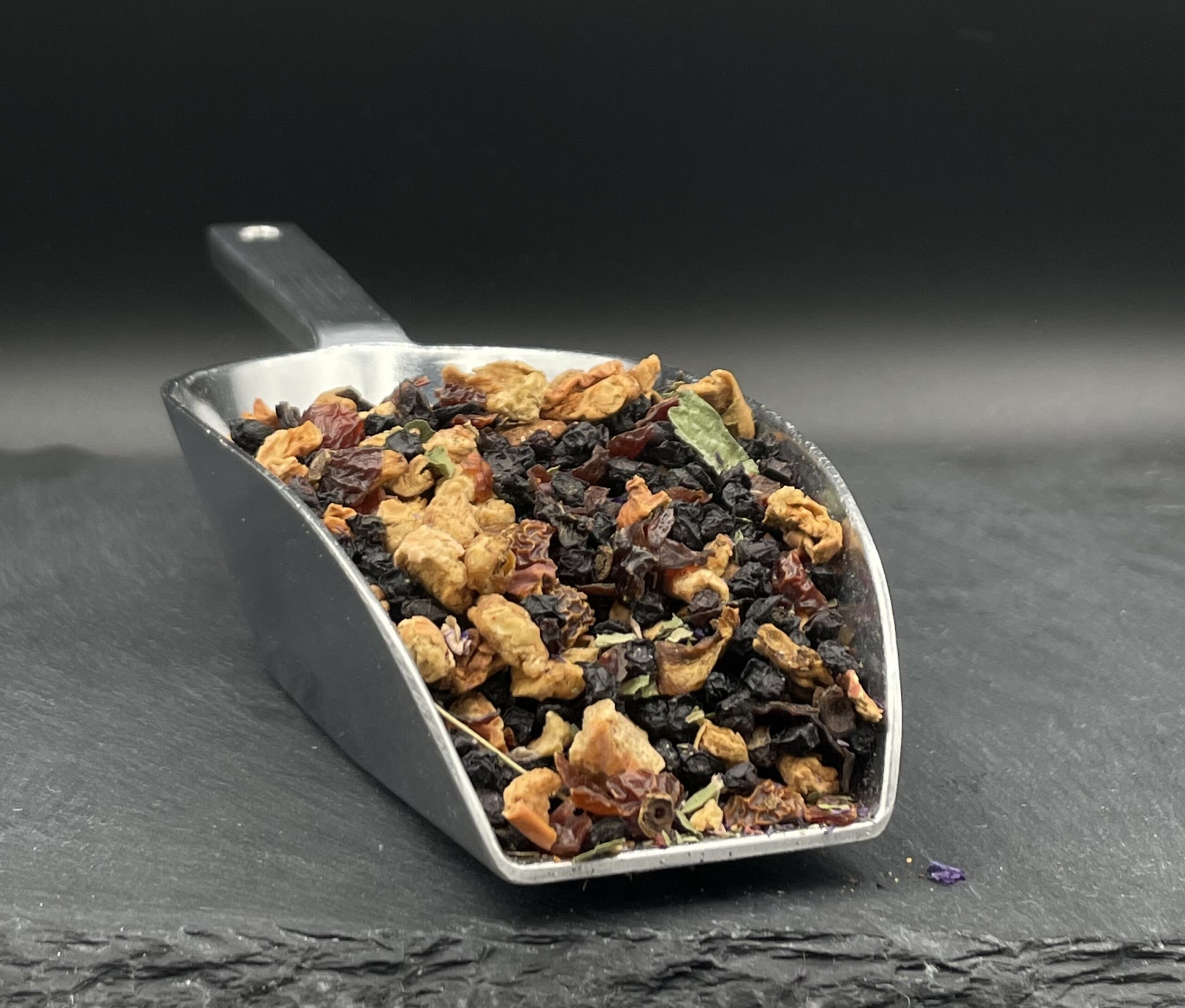 Infusion à la pomme, baie de sureau, cynorrhodon, myrtille sauvage, groseille, feuilles de mûre, mauve, cassis, mûre